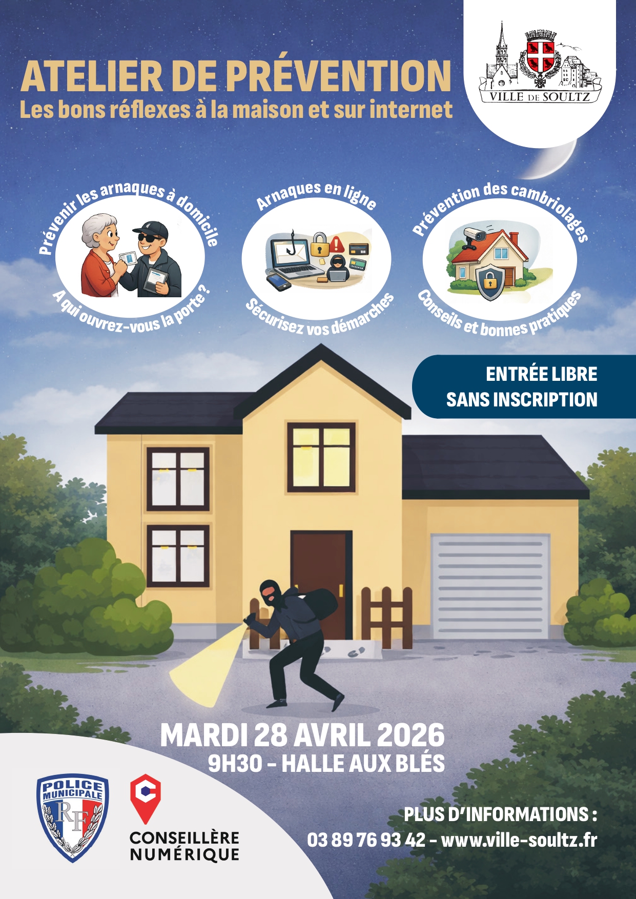 La Ville de Soultz propose un atelier de prévention dédié aux bons réflexes à adopter au quotidien, à domicile comme en ligne. Cette rencontre, animée par la Police Municipale ainsi que la conseillère numérique, permettra d’aborder les principales formes d’arnaques, les risques de cambriolage ainsi que les bonnes pratiques pour sécuriser vos démarches et protéger votre foyer.