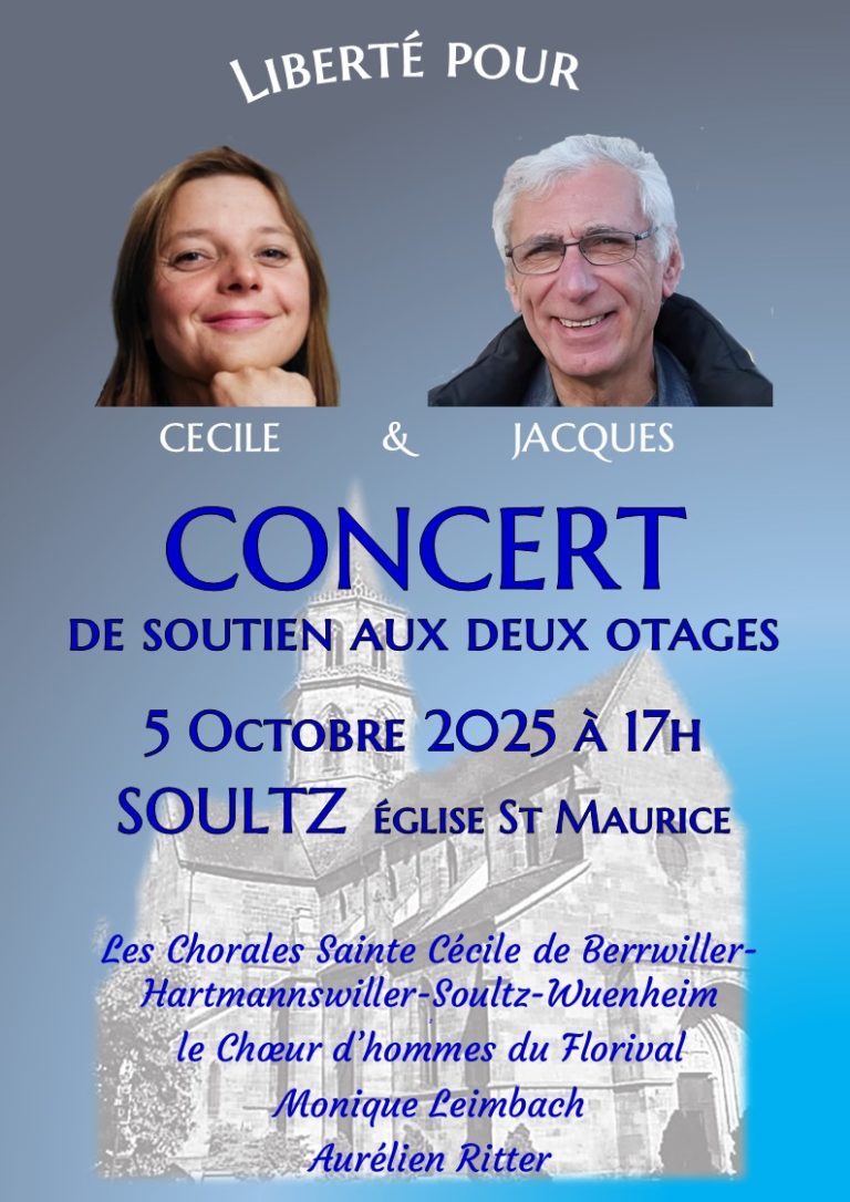 Un concert de soutien aux deux otages Cécile et Jacques aura lieu le dimanche 5 octobre 2025 à 17h, en l’église Saint-Maurice de Soultz.